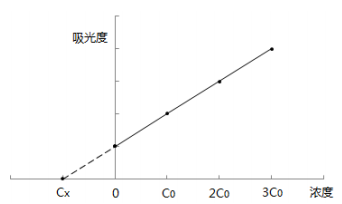 分別量取四份等量待測試樣(濃度為Cx),配制總體積相同的四份溶液。第一份不加標(biāo)準(zhǔn)溶液,第二、三、四份分別按比例加入不同濃度的標(biāo)準(zhǔn)溶液,四份溶液的濃度分別為:Cx、Cx+Co、Cx+2Co、Cx+3Co;加入標(biāo)準(zhǔn)溶液Co的濃度約等于0.5倍量的試樣濃度,即Co≈0.5Cx。用空白 溶液調(diào)零,在相同條件下依次測定四份溶液的吸光度。以吸光度為縱坐標(biāo),加入標(biāo)準(zhǔn)溶液的濃度為橫坐標(biāo),繪制校準(zhǔn)曲線,曲線反相延伸與橫坐標(biāo)的交點(diǎn)即為待測試樣的濃度。待測試樣濃度與對應(yīng)吸光度的關(guān)系見圖A.1。