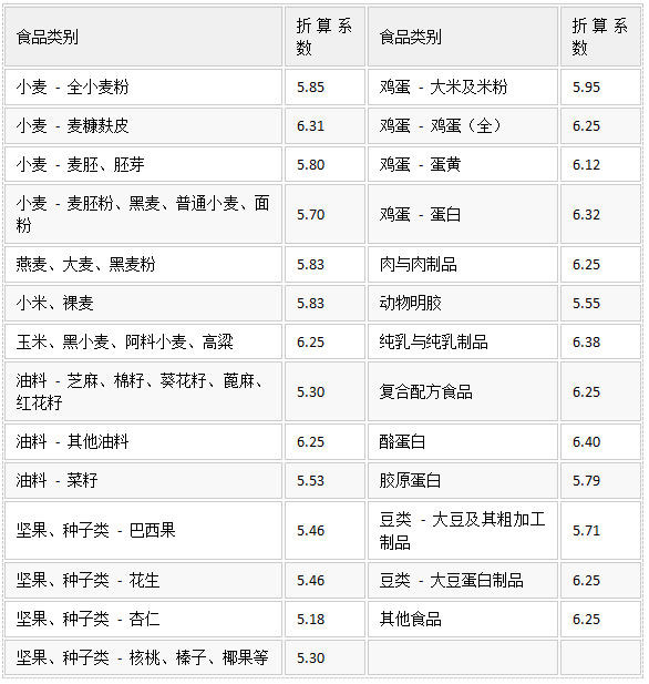 常見食物中的氮折算成蛋白質的折算系數見表 A.1。