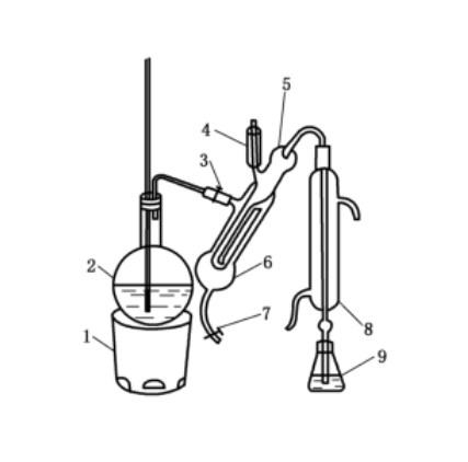 5.1.3 向接收瓶內加入10.0 mL硼酸溶液及1滴~2滴混合指示液(B)并保持滿瓶,并使冷凝管的 下端插入液面下,根據試樣中氮含量,準確吸取2.0 mL~10.0 mL試樣處理液由小玻杯注入反應室,以10 mL水洗滌小玻杯并使之流入反應室內,隨后塞緊棒狀玻塞。將10.0 mL氫氧化鈉溶液倒入小玻杯,提起玻塞使其緩緩流入反應室,立即將玻塞蓋緊,并加水封。夾緊螺旋夾,開始蒸餾。蒸餾10 min 后移動蒸餾液接收瓶,液面離開冷凝管下端,再蒸餾1 min。然后用少量水沖洗冷凝管下端外部,取下蒸餾液接收瓶。以硫酸或鹽酸標準滴定溶液滴定至終點,如用A混合指示液,終點顏色為灰藍色;如用B混合指示液,終點顏色為淺紅色。同時做試劑空白。