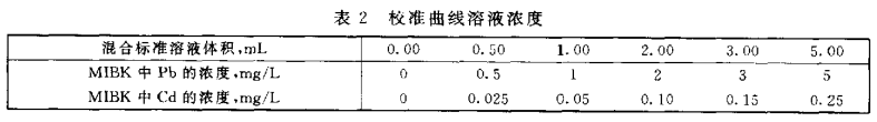 參考表2在100mL分液漏斗中加入鉛、鎘混合標(biāo)準(zhǔn)使用液(3.13),其濃度范圍應(yīng)包括試樣中鉛、鎘的濃度。然后加入1mL鹽酸溶液(3.2),加水至50mL左右,以下操作同(6.1.2)。按步驟(6.2)中的條件由低到高濃度順次測(cè)定標(biāo)準(zhǔn)溶液的吸光度。