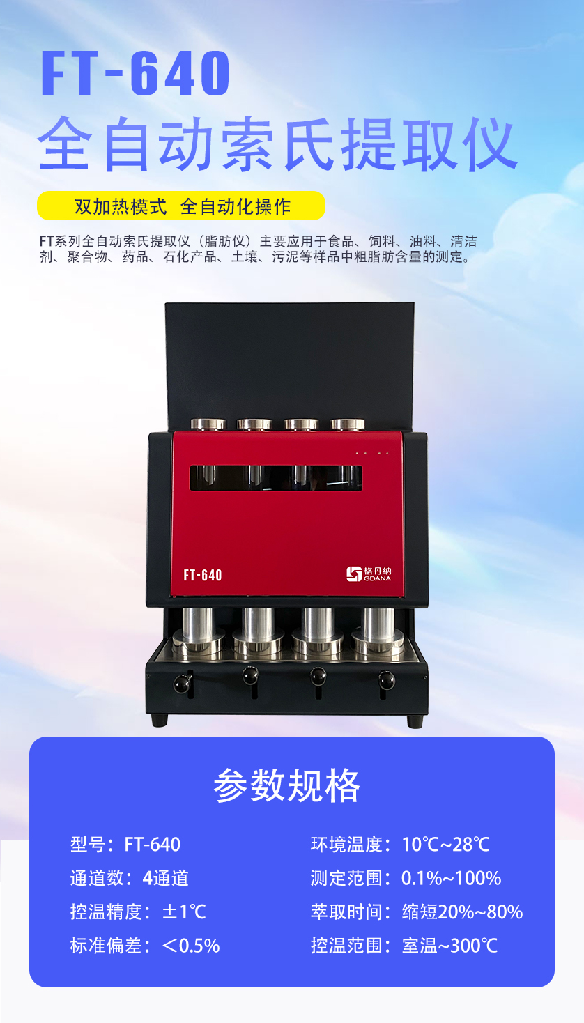 FT640索氏提取自動脂肪儀主要應用于食品、飼料、油料、清潔劑、聚合物、藥品、石化產(chǎn)品、土壤、污泥等樣品中粗脂肪含量的測定。
