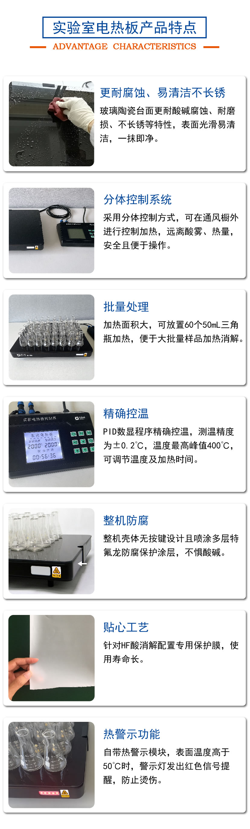 HT-400陶瓷加熱板專用于無機化學元素分析時對各類樣品作加熱、消煮、趕酸用的恒溫加熱裝置。臺面具有耐酸堿,不生銹等特性;分體PID程序數(shù)顯控溫,是實驗室樣品預處理好助手。