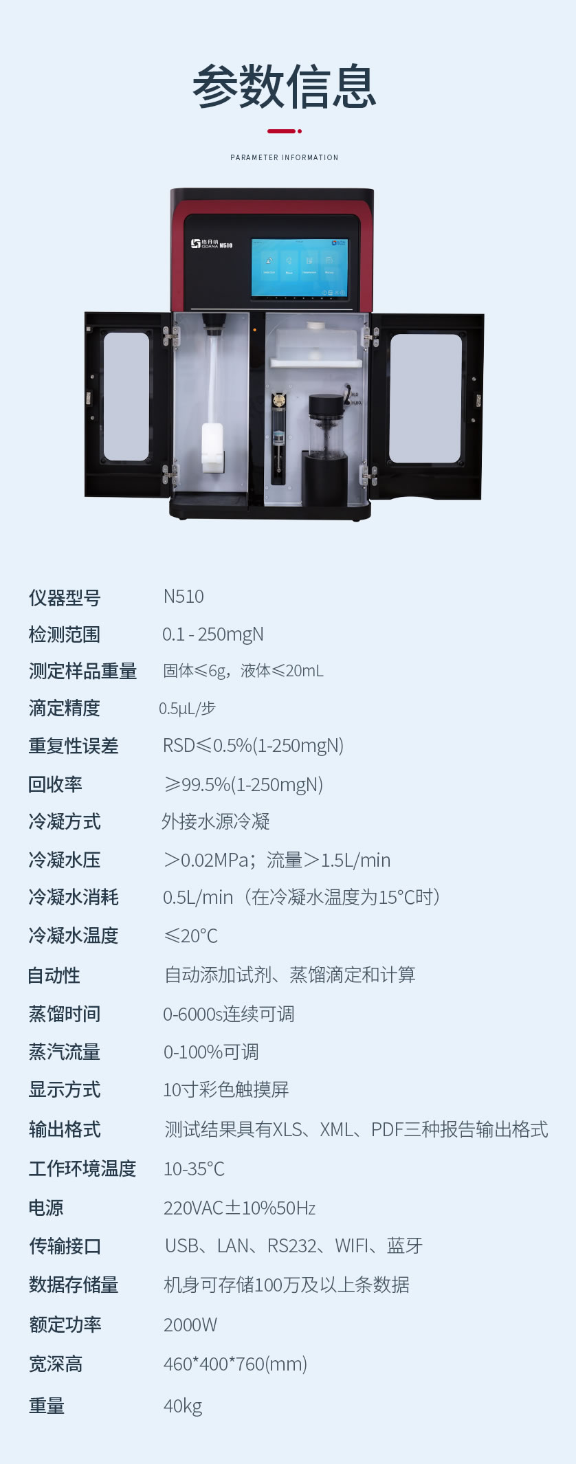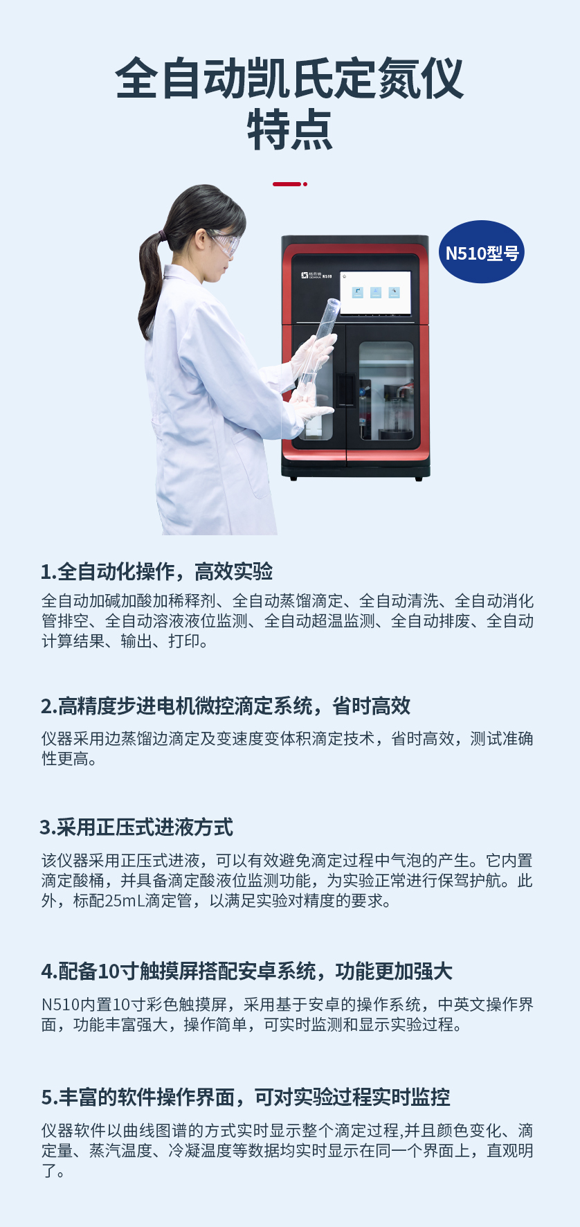 新一代N510全自動凱氏定氮儀集成了自動加堿加酸、自動加稀釋劑、蒸餾滴定、消化管排空、溶液液位監測、超溫監測、清洗排廢、結果計算等功能。采用符合國家標準的凱氏定氮方法:濃硫酸環境消解樣品、堿性環境蒸汽蒸餾、硼酸吸收、加指示劑滴定、終點顏色判定法。