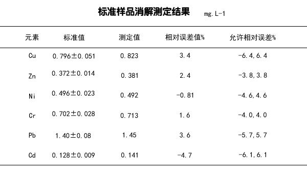 由表中可知,重金屬的測定值均在允許的相對誤差范圍內,方法的準確度高,能滿足分析的要求。