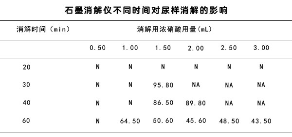 經過實驗優化得出:2.50mL尿液于消化管中,分別加入0.50—3.00mL的濃硝酸,于石墨消解儀中分別消解20~60min。結果顯示,以1.50mL的濃硝酸消解30min的回收率高。